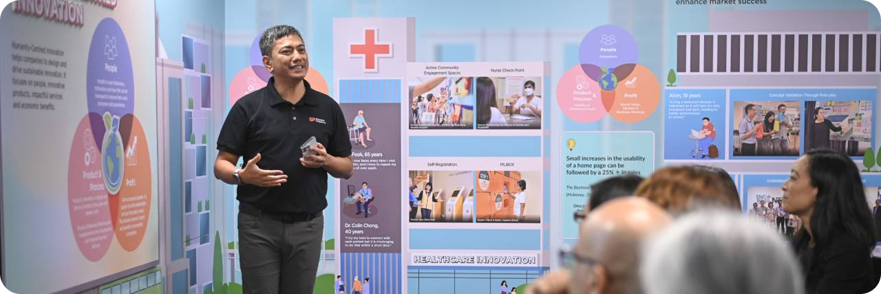 The DT|UX Learning Journey showcases Singapore Polytechnic’s Innovation Framework, powered by Humanity-Centred Design (HCD+). This interactive multimedia experience highlights SP’s impact across Singapore and Southeast Asia, guiding participants through the innovation journey.